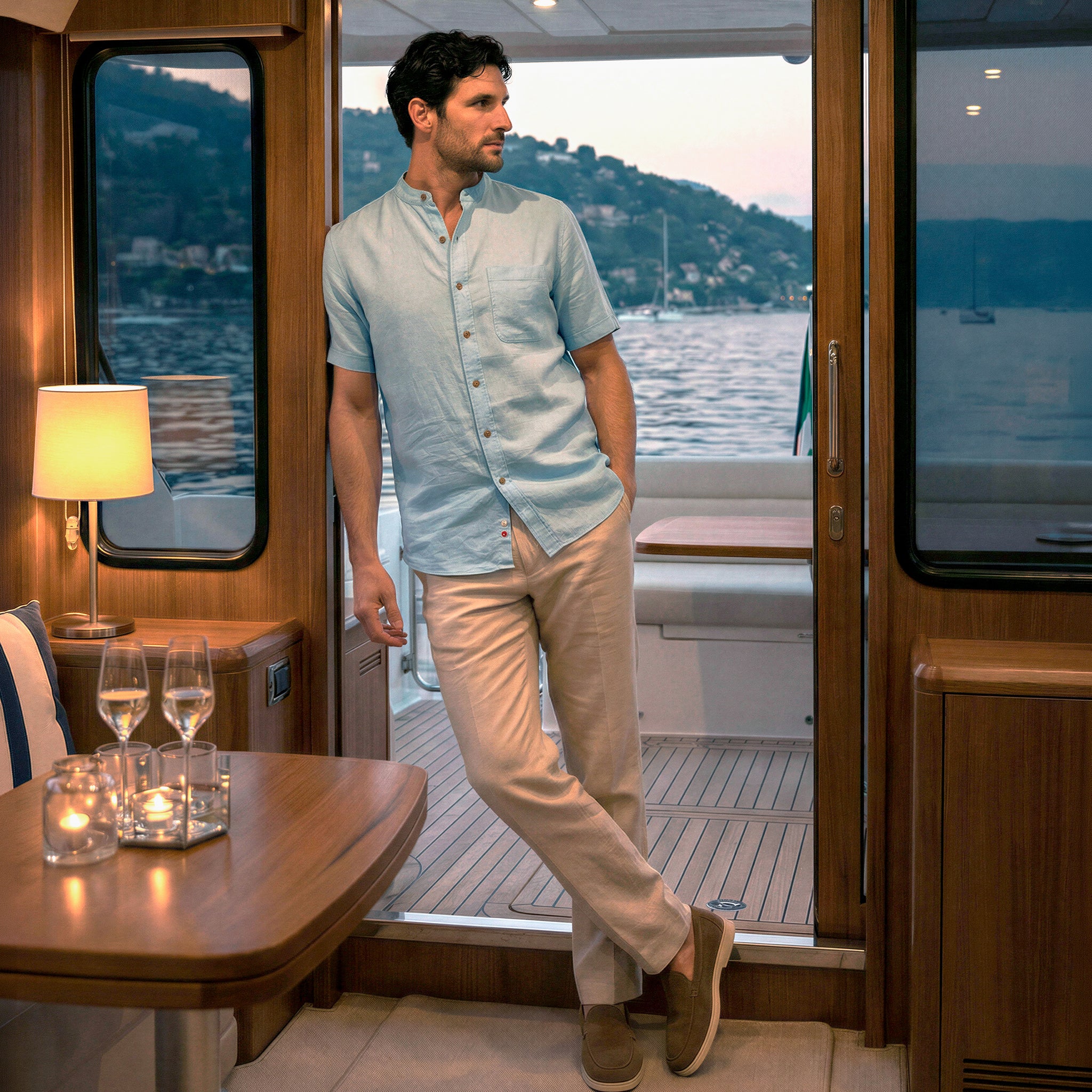 Camisa casual modelo Davide en color Aquamarine, manga corta, jaspe, cuello mao, bajos curvos y corte slim fit. Bolsa en frente izquierdo, pliegues y gancho en espalda. Ideal para días de sol con actitud relajada.