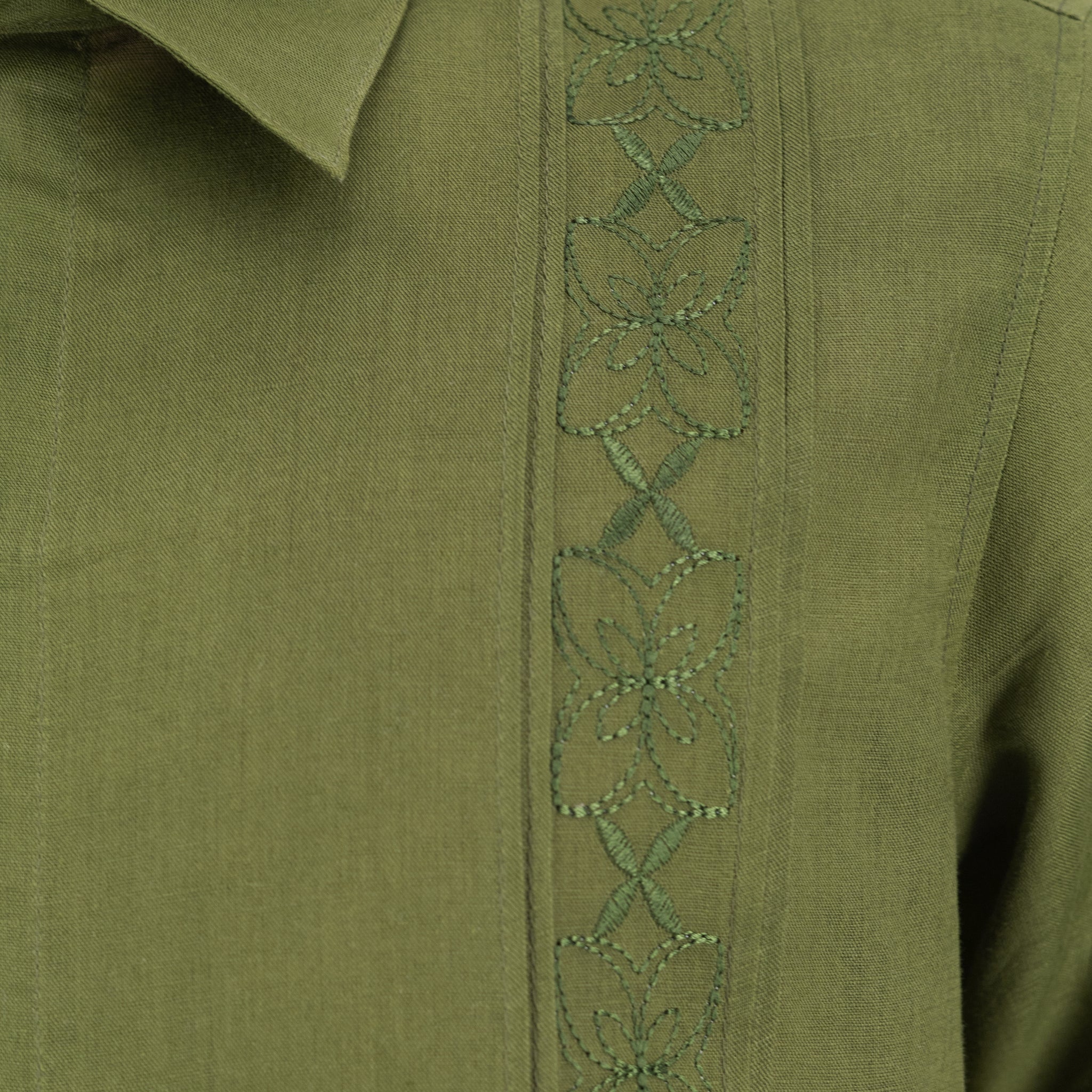 Camisa tipo guayabera de manga corta en un tono verde con bordado a tono. Esta prenda combina una paleta natural con un diseño clásico que proyecta serenidad, madurez y estilo con personalidad, ideal para quienes buscan destacar con elegancia sin llamar la atención de forma estridente.