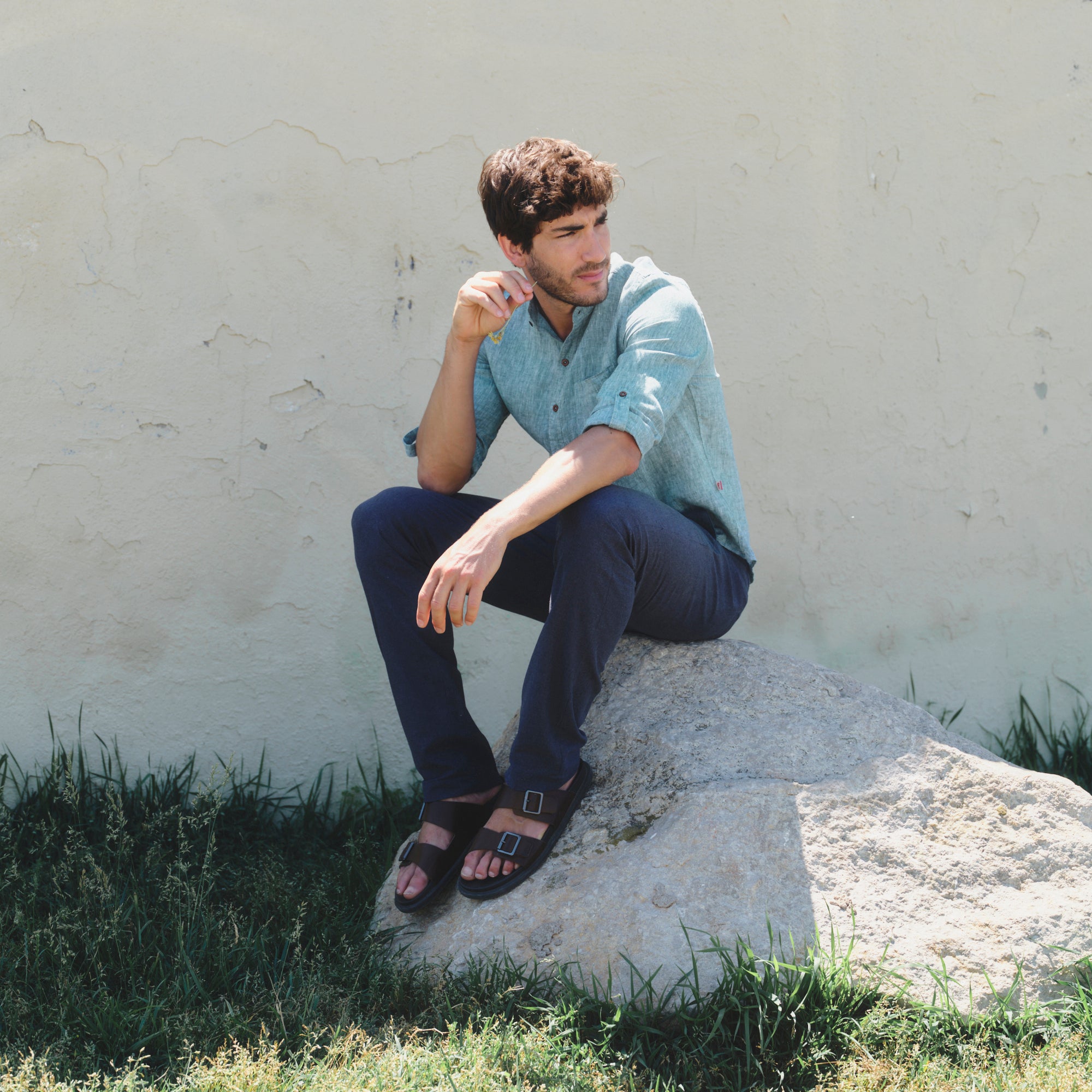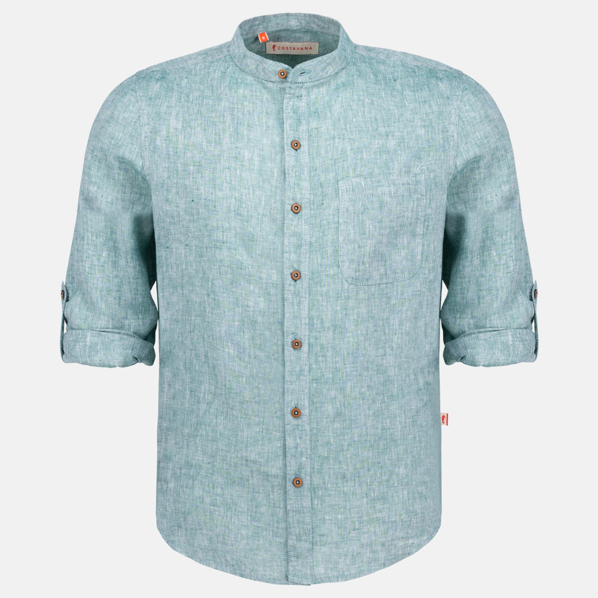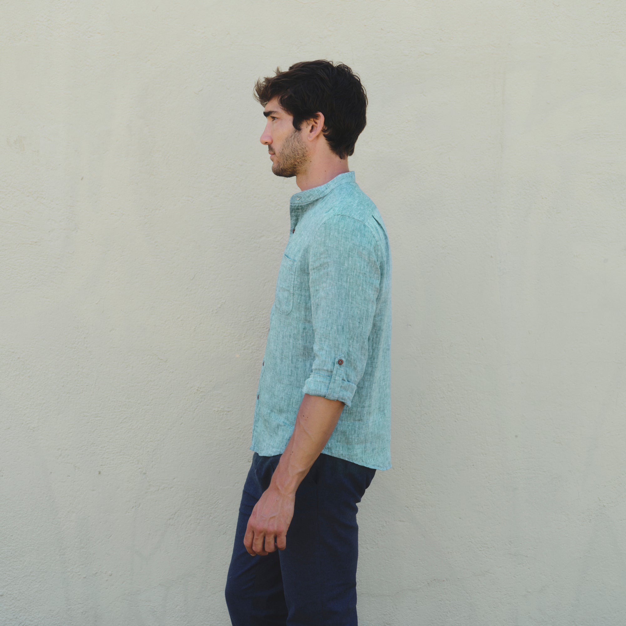 La Camisa casual manga larga modelo Davide en color possy green combina frescura, estilo y comodidad. De corte slim fit, manga larga con elevadores y cuello mao, ideal para días de sol con actitud relajada. Fabricada con lino y algodón.