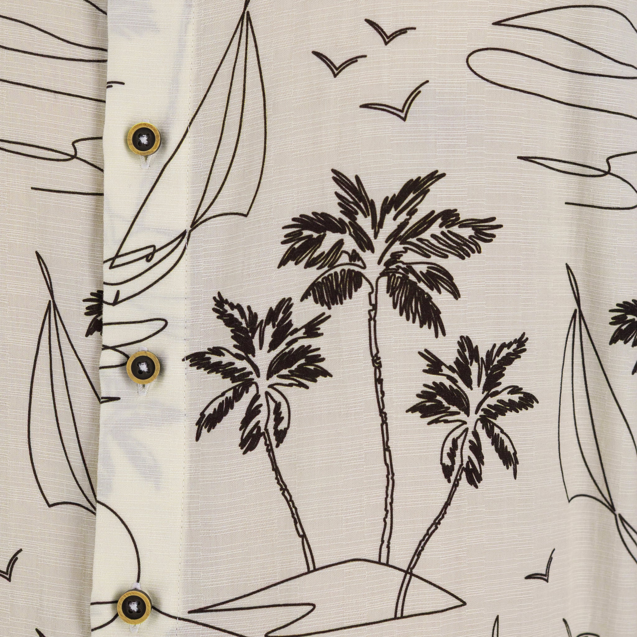 La camisa hawaiana “Alohi Black Lines" manga corta con corte regular y bajos curvos. Su base en tono beige, se convierte en el lienzo perfecto para un estampado fresco y encantador que mezcla en tonos relajantes. El resultado es una prenda versátil y vibrante, perfecta para quienes quieren llevar el verano puesto.