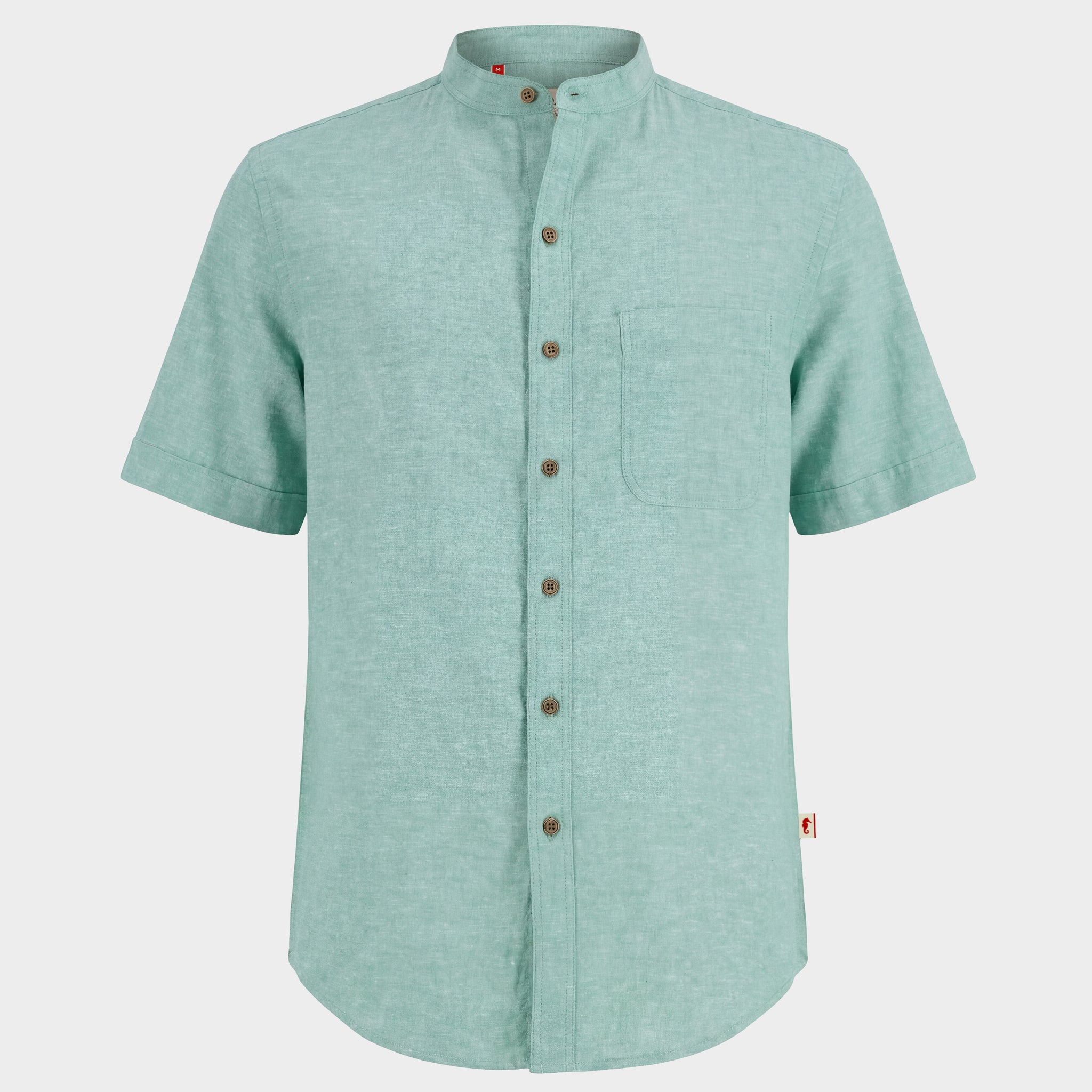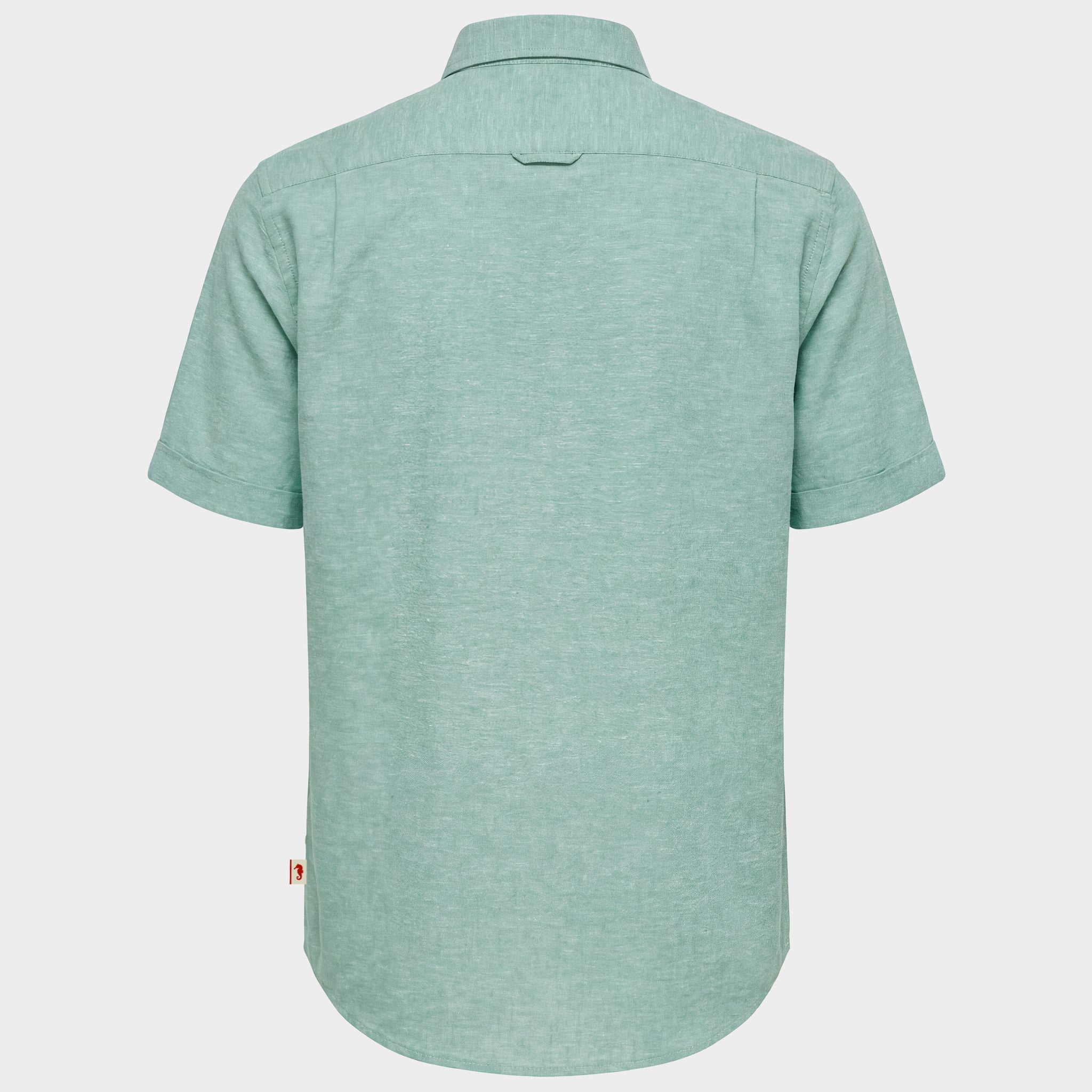 Camisa casual modelo Davide en color Green Spruce, manga corta, jaspe, cuello mao, bajos curvos y corte slim fit. Bolsa en frente izquierdo, pliegues y gancho en espalda. Ideal para días de sol con actitud relajada.